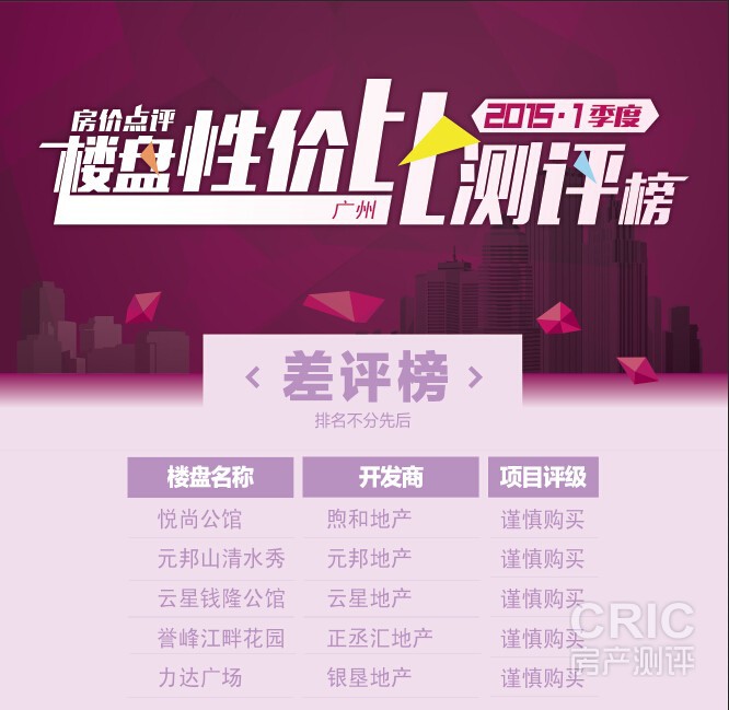 选择房子,人们无非是从房子的区位、交通、配套以及房子本身品质等角度去考虑,具有一定的共性。虽然不同的人有不同的需求,各人也有自己不同的观点,也可能有各自不一样的侧重面。但是往往会有楼盘在市场上表现一般,这些楼盘或是因价格太高,或是因配套欠缺,又或是因邻近墓园等因素而难以得到大部分购房者的青睐。在2015年一季度结束之际,CRIC房产测评网根据消费者最为关心的“房价指标”、“产品指标”和“销量指标”,通过真实、客观的打分,整理出了目前广州一季度性价比得分排名靠后的在售楼盘(该榜排名不分先后顺序),供购房者参考。另外需注意的是,所谓“差评”并非楼盘存在严重问题,而是依据性价比标准进行整体测评排名较为靠后。