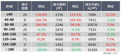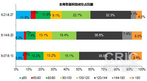 cric分析:从面积段上看,本周整体成交结构发生明显变化,小于60㎡面积段成交占比在老项目和昌贸易中心集中备案的影响下,面积段占比上升明显;60-80㎡及80-90㎡两个刚需面积段也有明显的增幅,历史主力成交面积段120-144㎡面积段虽稳坐榜首,但本周成交量占比出现小幅缩水。