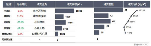 cric分析:本周五区成交面积呈“三涨两跌”。其中洛江区小米时代本周集中备案,成交面积一跃成为本周销冠,在其影响下,洛江区区域整体成交面积环比大幅上涨96.2%;丰泽区在万科城及东海湾三盘(御花园、十二宴、太古三期)的联动下,区域成交面积也出现明显上涨,环比上升39.9%。成交均价方面,洛江区受小米时代低单价影响,区域均价环比下降20.6%。