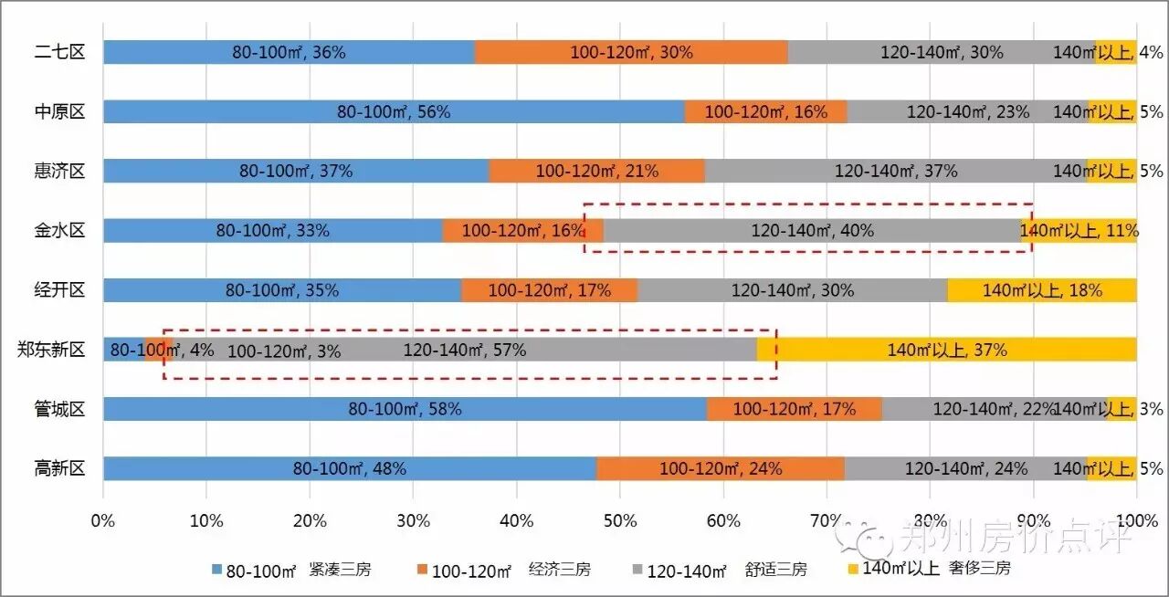 表现在区域上,郑东新区、金水区120㎡以上三房占比超50%,说明改善客户更多愿意选择金水区和郑东新区作为改善置业首选。