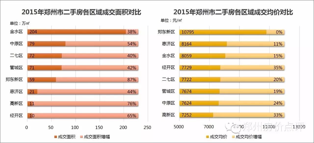 因为片区配套相对完善,所以金水区成为二手房成交量集中区域,成交面积较2014年增长38%;郑东新区一手房价格带动二手房价格,所以在二手房价格上,郑东新区遥遥领先;